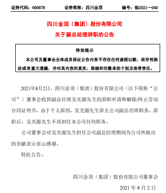 同期,四川金頂連續(xù)發(fā)布兩則高管辭職公告。2021年8月2日,四川金頂(集團)股份有限公司董事會收到副總經(jīng)理吳光源先生的辭職申請和解除/終止勞動合同證明書。由于個人原因,吳光源先生辭去公司副總經(jīng)理職務(wù)。吳光源先生不再擔(dān)任公司任何職務(wù)。