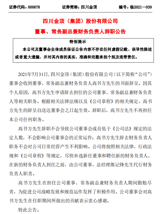 四川金頂公告,2021年7月31日,公司董事會收到董事、常務(wù)副總兼財務(wù)負責(zé)人高書方先生的書面辭呈。因其個人原因,高書方先生申請辭去擔(dān)任的公司董事、常務(wù)副總兼財務(wù)負責(zé)人等相關(guān)職務(wù)。根據(jù)相關(guān)法律法規(guī)以及《公司章程》的相關(guān)規(guī)定,高書方先生的辭呈自送達董事會之日起生效。辭職后,高書方先生不再擔(dān)任公司任何職務(wù)。