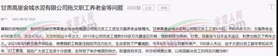 近日,有網(wǎng)友反映,甘肅高崖金城水泥有限公司拖欠員工工資6個月,約600多萬元,欠繳養(yǎng)老金4700多萬元,涉及470人,欠繳時間達十年之久;