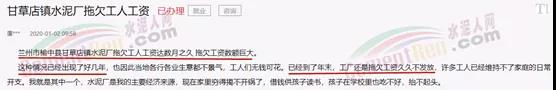 2021年1月2日,有網(wǎng)友在人民網(wǎng)留言板反映,甘肅省蘭州市榆中縣甘草店鎮(zhèn)水泥廠拖欠工人工資達數(shù)月之久,拖欠工資數(shù)額巨大。年末工廠還是拖欠工資久久不發(fā)放,許多工人已經(jīng)維持不了家庭的日常開支。