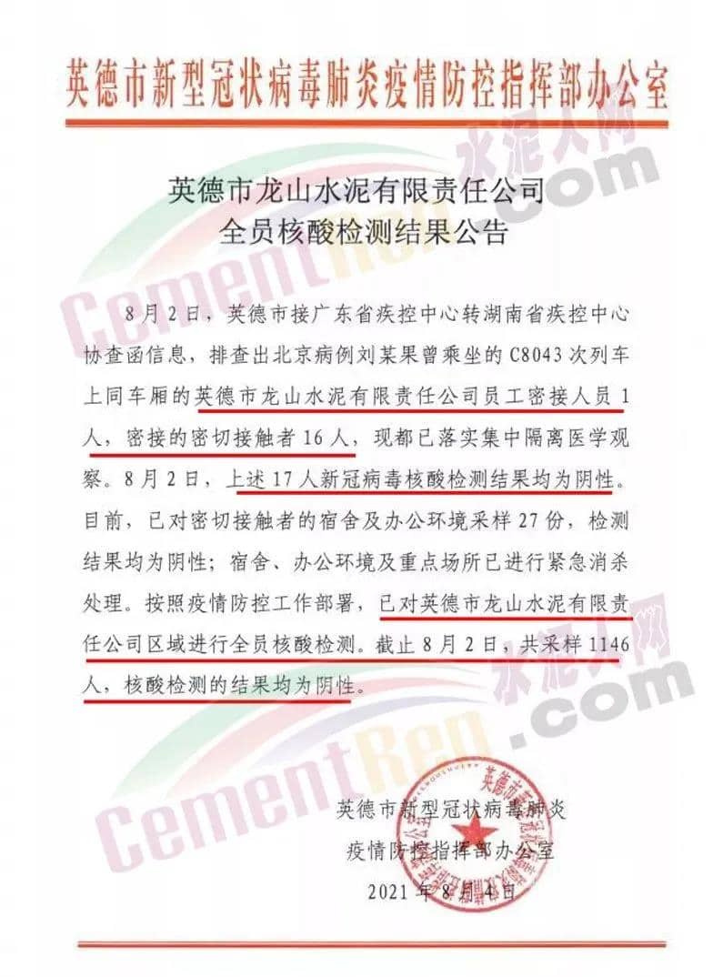 8月2日,上述17人新冠病毒核酸檢測(cè)結(jié)果均為陰性。目前,已對(duì)密切接觸者的宿舍及辦公環(huán)境采樣27份,檢測(cè)結(jié)果均為陰性;宿舍、辦公環(huán)境及重點(diǎn)場(chǎng)所已進(jìn)行緊急消殺處理。按照疫情防控工作部署,已對(duì)英德市龍山水泥有限責(zé)任公司區(qū)域進(jìn)行全員核酸檢測(cè)。截止8月2日,共采樣1146人,核酸檢測(cè)的結(jié)果均為陰性。