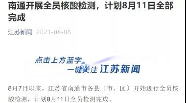 江蘇南通:8月7日以來,江蘇省南通市各縣(市)區(qū)開始進(jìn)行全員核酸檢測(cè),計(jì)劃8月11日全員檢測(cè)完成。
