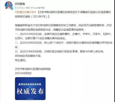河南開封:自2021年8月8日起,將尉氏縣莊頭鎮(zhèn)前曹村、后曹村、于家村、文家村、劉家村、孫莊村、田家村等7個(gè)地區(qū)調(diào)整為高風(fēng)險(xiǎn)地區(qū);除上述7個(gè)地區(qū)外,將尉氏縣莊頭鎮(zhèn)其他區(qū)域調(diào)整為中風(fēng)險(xiǎn)地區(qū)。對(duì)尉氏縣全域執(zhí)行防控區(qū)管理,暫停與外界人員往來。