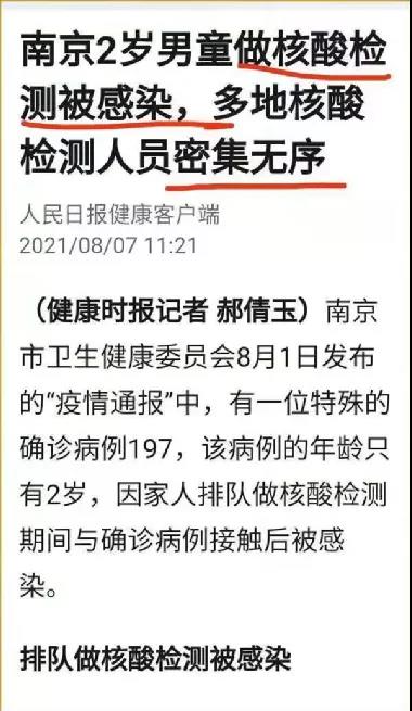 多地群眾反應(yīng),檢測(cè)現(xiàn)場(chǎng)亂糟糟的一堆人擁擠推搡,進(jìn)展緩慢且隊(duì)伍越來越長(zhǎng),部分熟人一同排隊(duì)不戴口罩還唾沫橫飛的聊天,哪顧得什么“一米線”的限制。南京某2歲男童隨家人排隊(duì)做核酸檢測(cè),期間家人與鄰居有近距離交談(接觸確診病例),后隨家人與另一鄰居在家后院交談(接觸確診病例),此后被診斷為新冠肺炎確診病例,讓人倒吸一口涼氣。