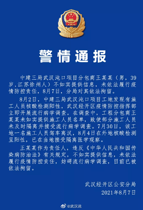 8月7日,武漢經(jīng)開區(qū)公安分局發(fā)布警情通報:中建三局武漢沌口項目分包商王某某(男,39歲,江蘇徐州人)不如實提供信息,未依法履行疫情防控責(zé)任,8月7日,分局對其依法拘留。