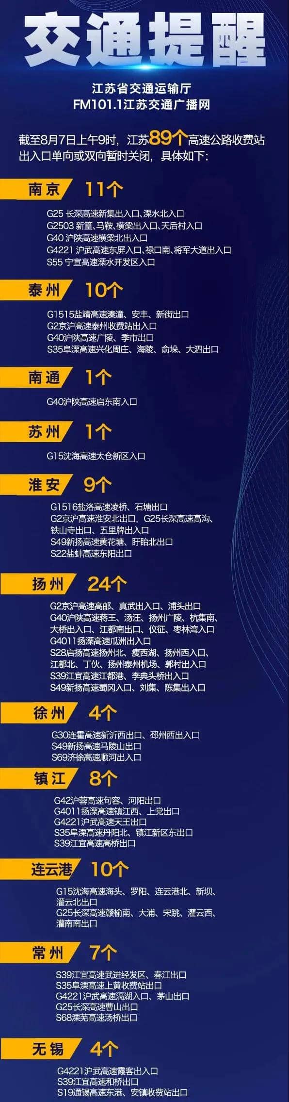據(jù)江蘇省交通運輸廳報道,全省高速公路運行總體平穩(wěn)。截至8月7日上午9時,南京、泰州、南通、蘇州、淮安、揚州、徐州、鎮(zhèn)江、連云港、常州、無錫等地區(qū)89個高速公路收費站出入口單向或雙向暫時關閉。全省28條普通國省道單向或雙向暫時封閉。