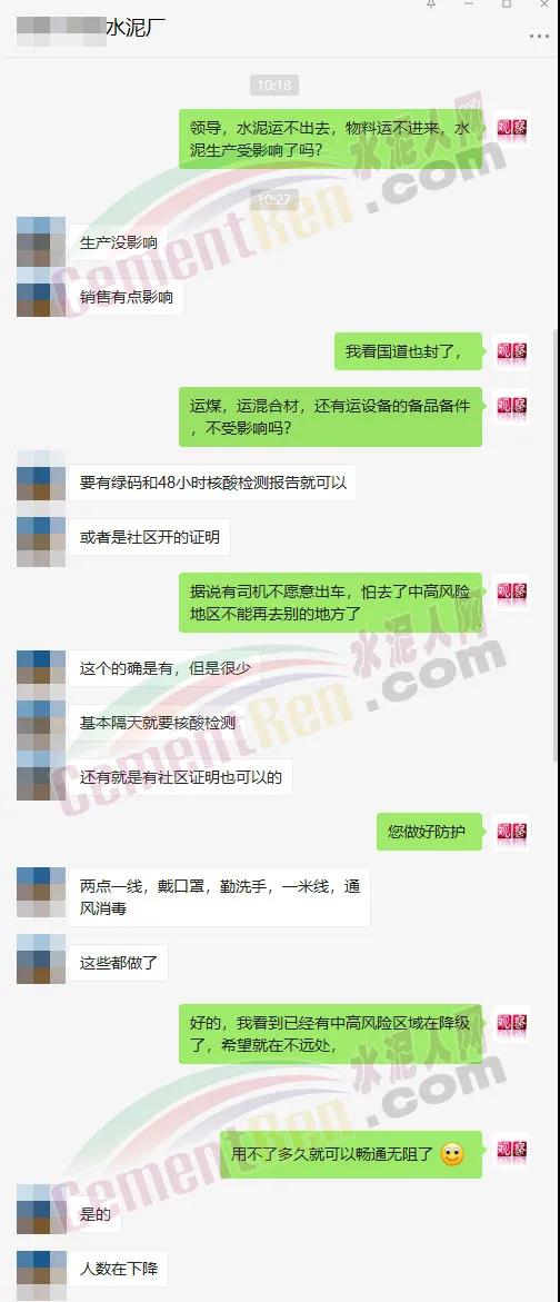 南京市某水泥企業(yè)負責人對水泥人網(wǎng)表示,目前南京市執(zhí)行嚴格管控,物流運輸司機要有綠碼和48小時核酸檢測報告,才可以。所有員工基本隔天就要做一次核酸檢測。