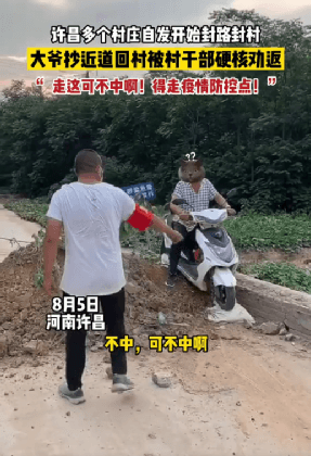 圖:8月5日,河南許昌,為了疫情防控村莊自發(fā)封路封村,大爺抄近道回村被村干部硬核勸返:“不中,那可不中!走疫情防控點!”