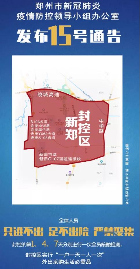 鄭州發(fā)布2021年15號通告將新鄭市域內新舊G107國道連接線以北、S103省道連接李誡路連接翠竹路連接Y062鄉(xiāng)道連接S103省道以東、繞城高速以南、中華路以西區(qū)域內的居民小區(qū)調整為封控區(qū)。封控區(qū)內全體人員實行“只進不出、足不出院、嚴禁聚集”管理措施,封控的第1、4、7天分別進行一次全員核酸檢測。