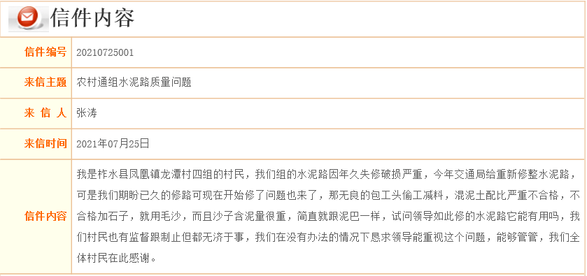 日前,有村民有陜西省商洛政府網(wǎng)市長信箱留言反應(yīng)農(nóng)村通組水泥路質(zhì)量問題稱:“我是柞水縣鳳凰鎮(zhèn)龍?zhí)洞逅慕M的村民,我們組的水泥路因年久失修破損嚴(yán)重,今年交通局給重新修整水泥路,可是我們期盼已久的修路可現(xiàn)在開始修了問題也來了,那無良的包工頭偷工減料,混凝土配比嚴(yán)重不合格,不合格加石子,就用毛沙,而且沙子含泥量很重,簡直就跟泥巴一樣,試問領(lǐng)導(dǎo)如此修的水泥路它能有用嗎,我們村民也有監(jiān)督跟制止但都無濟于事,我們在沒有辦法的情況下懇求領(lǐng)導(dǎo)能重視這個問題,能夠管管,我們?nèi)w村民在此感謝。”