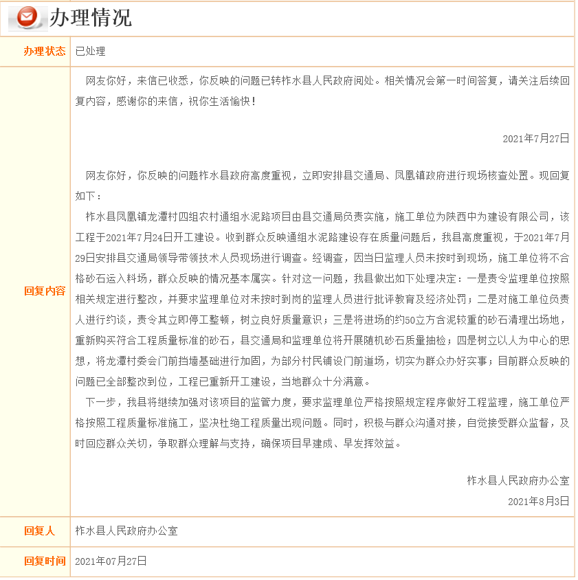 8月3日,柞水縣人民政府辦公室作出回復(fù),柞水縣政府高度重視,立即安排縣交通局、鳳凰鎮(zhèn)政府進行現(xiàn)場核查處置。并回復(fù)如下: