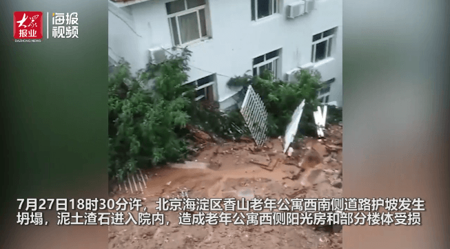 7月27日18時(shí)30分許,北京海淀區(qū)香山老年公寓西南側(cè)道路護(hù)坡坍塌,泥土渣石進(jìn)入院內(nèi),造成西側(cè)陽光房和部分樓體受損,造成老年公寓5人遇難。據(jù)了解,當(dāng)日香山地區(qū)雨量3小時(shí)累計(jì)達(dá)100mm。由于雨水太大,街上的雨水甚至超過了街道兩側(cè)臺(tái)階的高度。