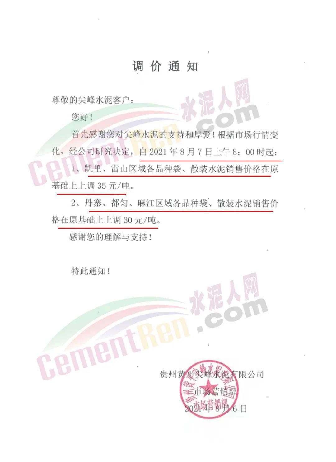 貴州黃平尖峰水泥有限公司市場營銷部通知根據(jù)市場行情變化,經(jīng)公司研究決定,自2021年8月7日上午8時起黃平、施秉區(qū)域各品種袋、散裝水泥銷售價格在原基礎上上調(diào)50元/噸。
