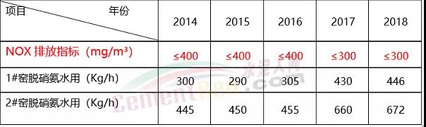 日照中聯(lián)水泥擁有兩條2*2500t/d新型干法水泥熟料生產(chǎn)線,采用窯外預(yù)分解旋窯生產(chǎn)工藝。應(yīng)環(huán)保要求,2014年日照中聯(lián)水泥增加SNCR脫硝系統(tǒng)降低NOX排放。使用初期,NOX排放指標(biāo)為400mg/m³以下,脫硝氨水使用量1#窯約300Kg/h,2#窯約450Kg/h。在2017年NOX排放指標(biāo)調(diào)整為300mg/m³以下,1#窯約430Kg/h,2#窯約650Kg/h,下表是2014年至2018年脫硝氨水消耗統(tǒng)計。