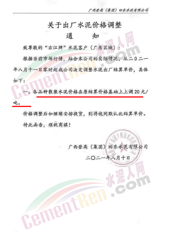 水泥人網(wǎng)通訊員消息:8月10日,廣西登高(集團)田東水泥有限公司通知根據(jù)當(dāng)前市場行情,結(jié)合公司的實際情況,從8月11日零時起公司決定調(diào)整廣東區(qū)域水泥出廠結(jié)算單價。各品種散裝水泥價格在原結(jié)算價格基礎(chǔ)上上調(diào)20元/噸。價格調(diào)整后如繼續(xù)安排提貨。