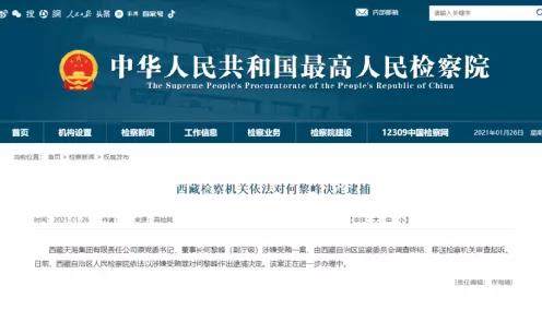 2021年1月26日,最高人民檢察院官網(wǎng)發(fā)布消息:西藏天海集團(tuán)有限責(zé)任公司原黨委書(shū)記、董事長(zhǎng)何黎峰(副廳級(jí))涉嫌受賄一案,由西藏自治區(qū)監(jiān)察委員會(huì)調(diào)查終結(jié),移送檢察機(jī)關(guān)審查起訴。何黎峰簡(jiǎn)歷顯示,他在2001年12月至2003年8月期間曾任西藏自治區(qū)天路股份有限公司黨委書(shū)記、副董事長(zhǎng)。