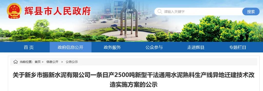日前,河南新鄉(xiāng)輝縣市人民政府發(fā)布《關(guān)于新鄉(xiāng)市振新水泥有限公司一條日產(chǎn)2500噸新型干法通用水泥熟料生產(chǎn)線異地遷建技術(shù)改造實施方案的公示》。