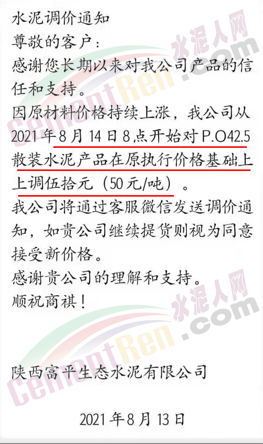陜西富平生態(tài)水泥有限公司通知因原材料價(jià)格持續(xù)上漲,公司從2021年8月14日8點(diǎn)開始對(duì)P.O42.5散裝水泥產(chǎn)品在原執(zhí)行價(jià)格基礎(chǔ)上上調(diào)50元/噸。公司將通過微信方式發(fā)送調(diào)價(jià)通知,如繼續(xù)提貨則視為同意接受新價(jià)格。