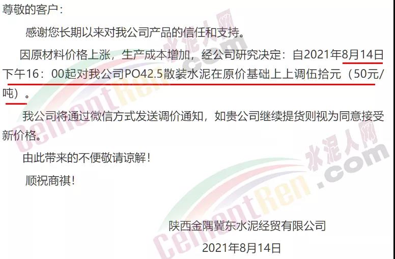 陜西金隅冀東水泥經(jīng)貿(mào)有限公司通知,因原材料價(jià)格上漲,生產(chǎn)成本增加,經(jīng)公司研究決定,自2021年8月14日下午16時(shí)起PO42.5散裝水泥在原價(jià)基礎(chǔ)上上調(diào)50元/噸。公司將通過微信方式發(fā)送調(diào)價(jià)通知,如繼續(xù)提貨則視為同意接受新價(jià)格。