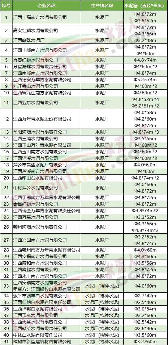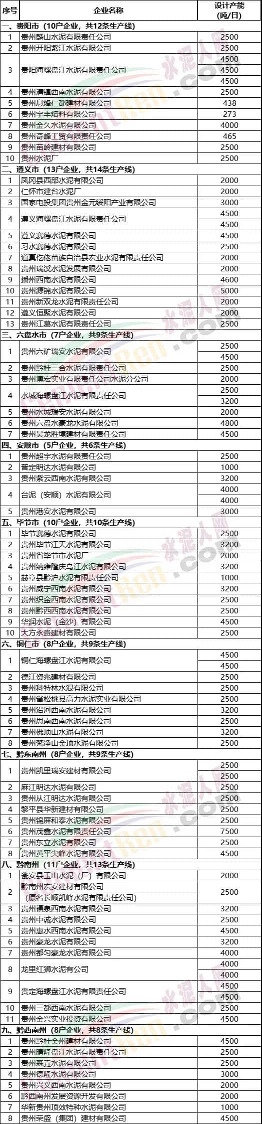 貴州省水泥熟料生產(chǎn)線清單