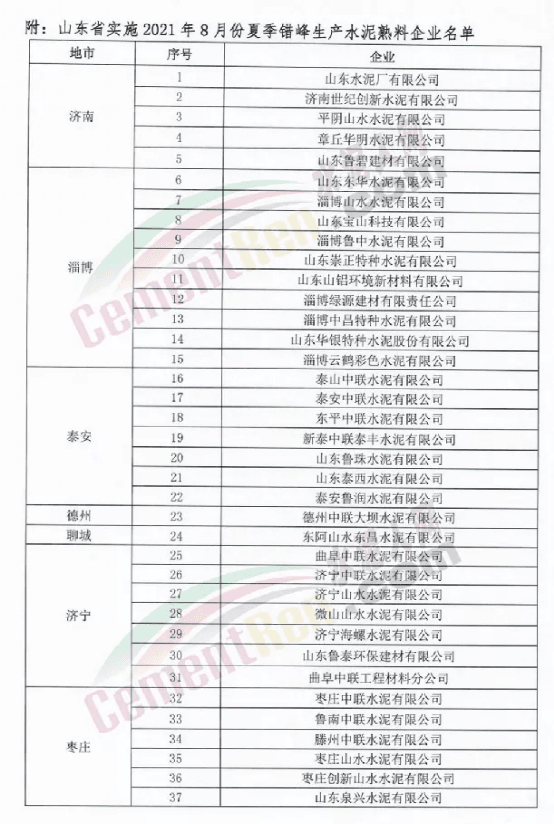山東省水泥熟料企業(yè)2021年8月份夏季錯峰生產(chǎn)的通知要求山東省內(nèi)72家企業(yè)從8月11日0點(diǎn)-8月30日24點(diǎn)停窯限產(chǎn)20天。