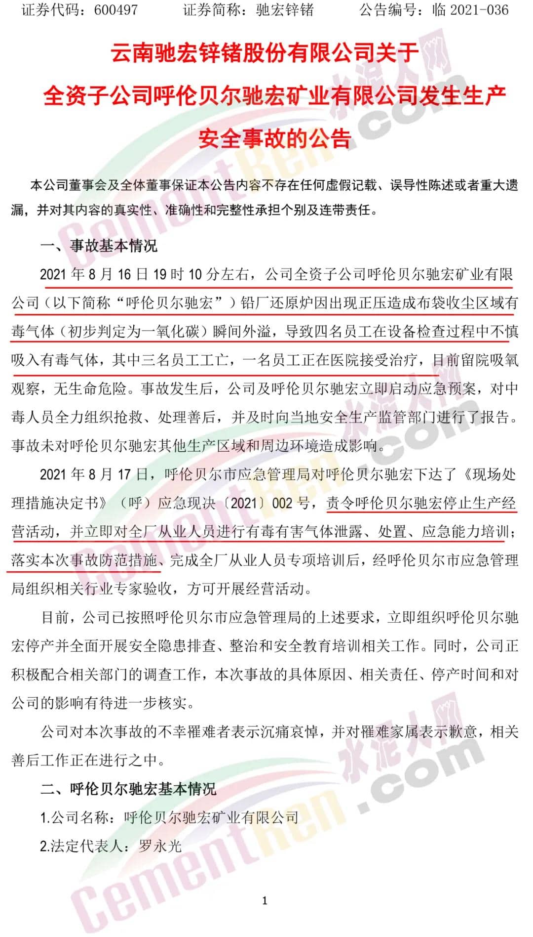 8月17日晚間,云南馳宏鋅鍺股份有限公司(600497.SH)發(fā)布公告稱,日前,全資子公司呼倫貝爾馳宏礦業(yè)有限公司出現(xiàn)有毒氣體外溢,致三名員工工亡,一名員工正在醫(yī)院接受治療,無生命危險(xiǎn),全資子公司目前停產(chǎn)整治。