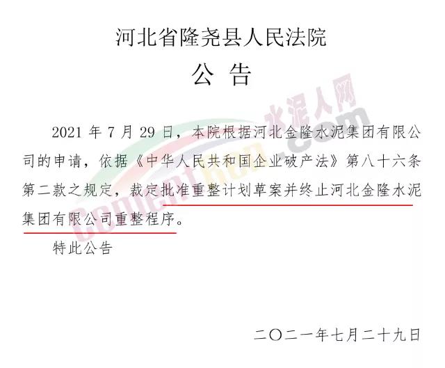 河北省隆堯縣人民法院發(fā)布公告稱,根據(jù)河北金隆水泥集團有限公司的申請,依據(jù)《中華人民共和國企業(yè)破產(chǎn)法》第八十六條第二款之規(guī)定,裁定批準重整計劃草案并終止河北金隆水泥集團有限公司重整程序。