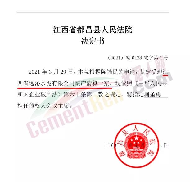 同期,江西省都昌縣人民發(fā)院發(fā)布決定書,稱裁定受理江西省遠沁水泥有限公司破產(chǎn)清算案。