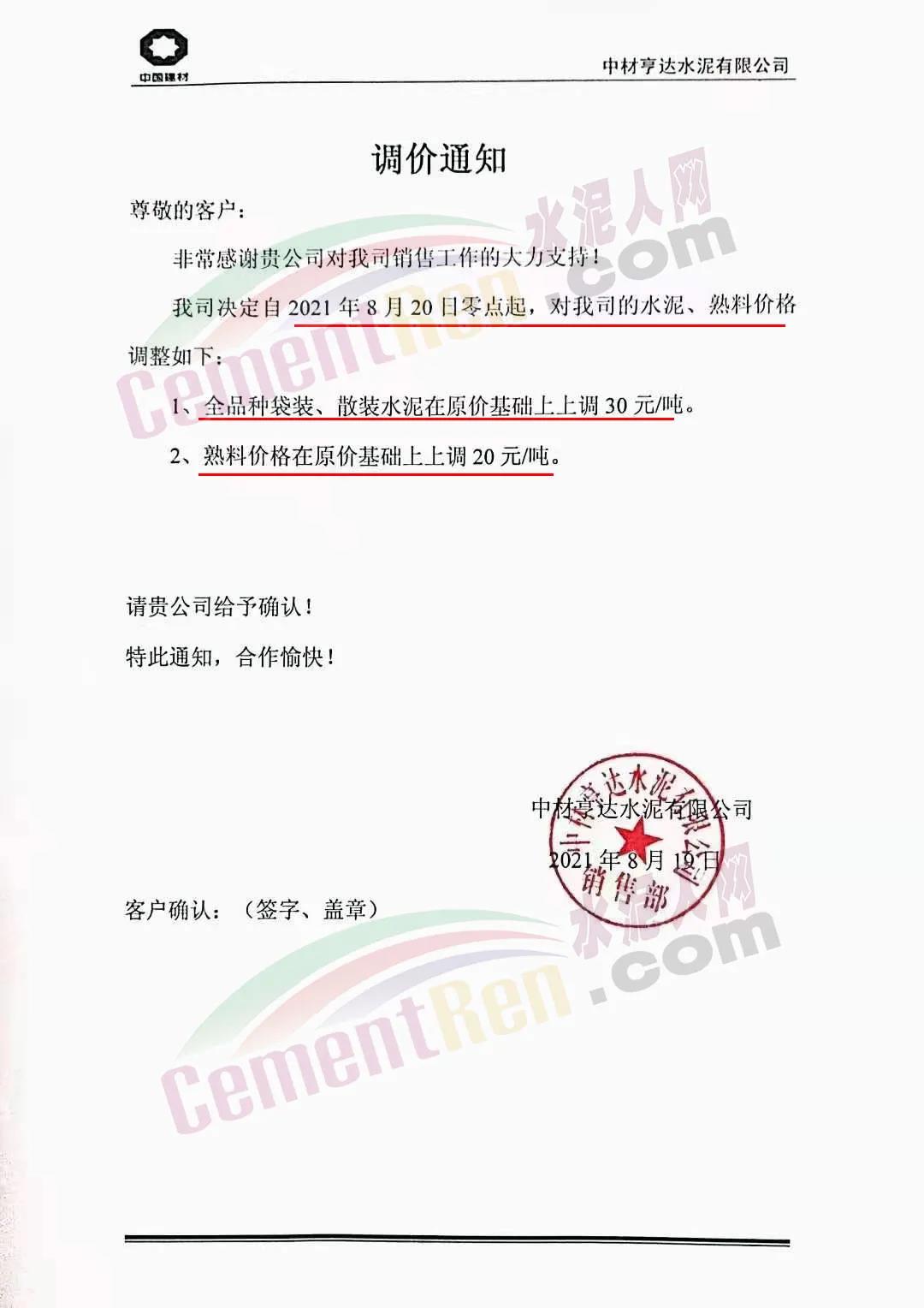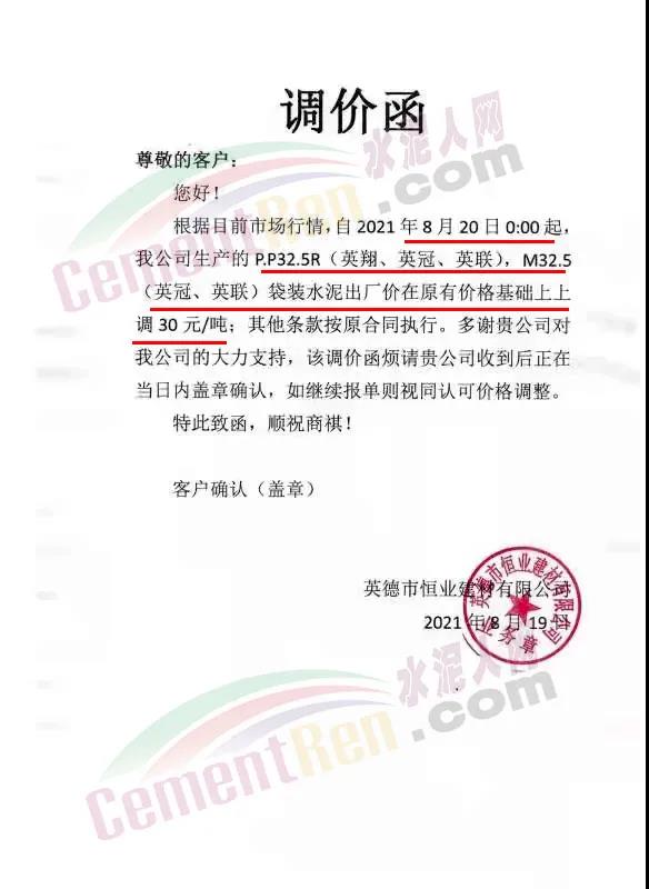英德市恒業(yè)建材有限公司通知,8月20日0時(shí)起,旗下各標(biāo)號(hào)水泥出廠價(jià)上調(diào)30元/噸。