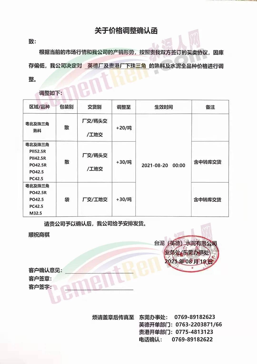 臺(tái)泥(英德)水泥有限公司通知,對(duì)英德廠及貴港廠下珠三角的熟料及水泥全品種價(jià)格進(jìn)行調(diào)整。熟料漲20元/噸,各標(biāo)號(hào)水泥袋裝及散裝漲30元/噸。