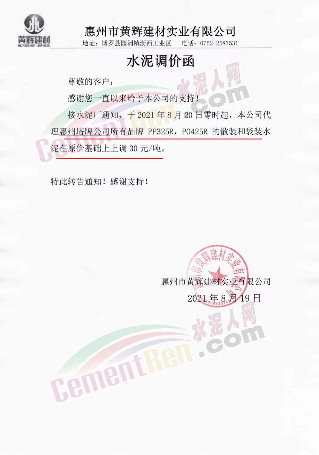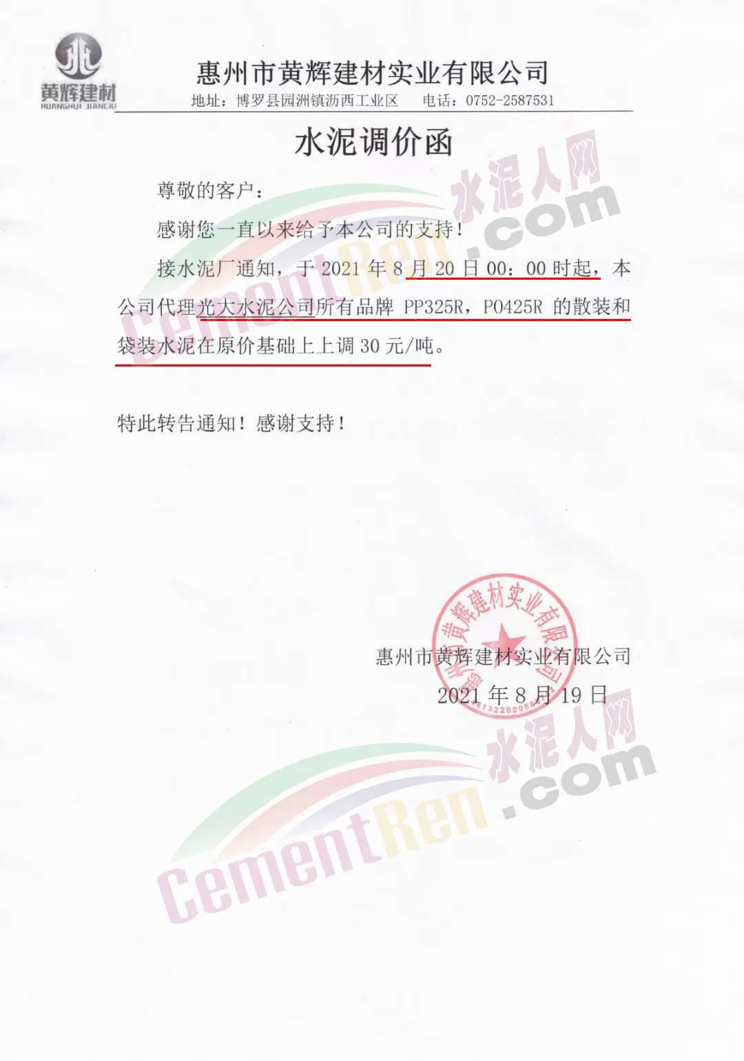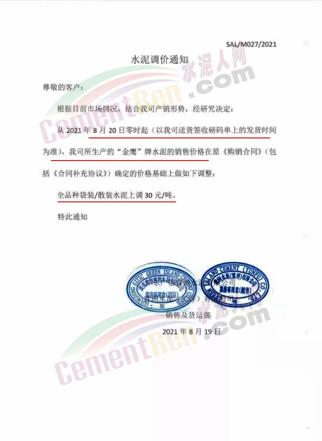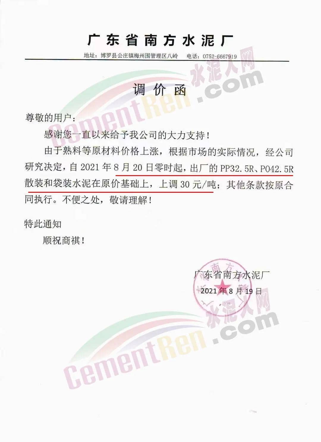 廣東省南方水泥廠通知,自8月20日零時(shí)起,各標(biāo)號(hào)水泥上調(diào)30元/噸。