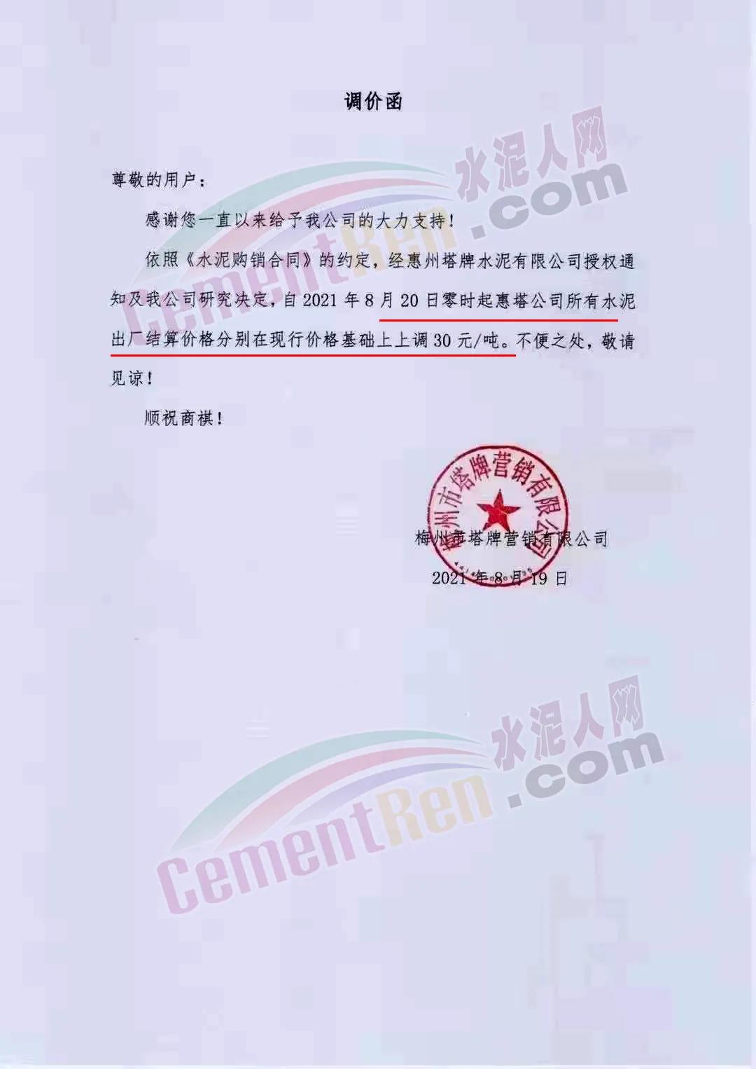 梅州市塔牌營(yíng)銷公司通知自8月20日零時(shí)起惠塔公司所有水泥出廠結(jié)算價(jià)格分別在現(xiàn)行價(jià)格基礎(chǔ)上上調(diào)30元/噸。