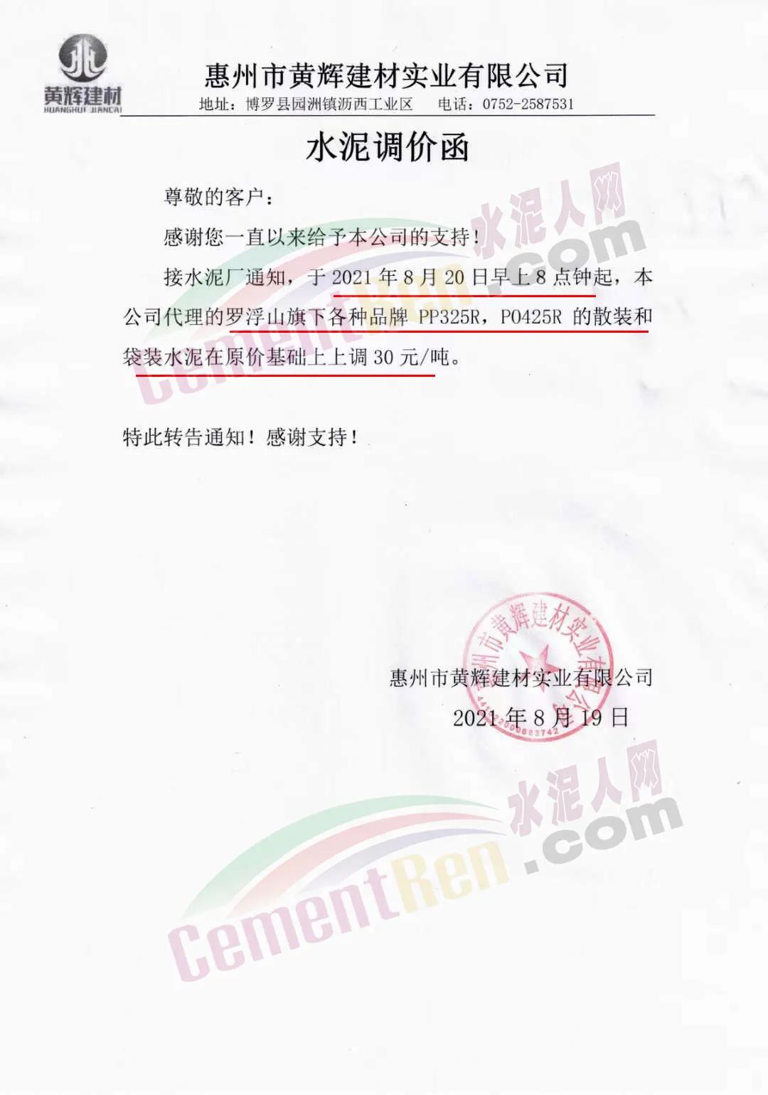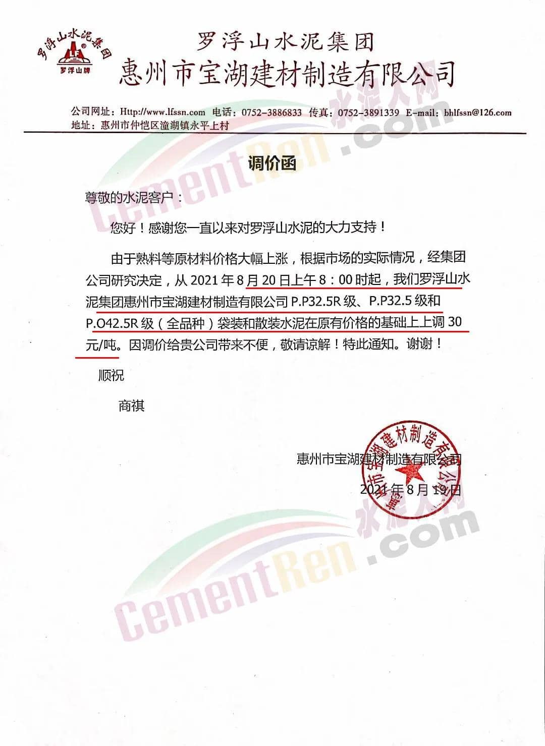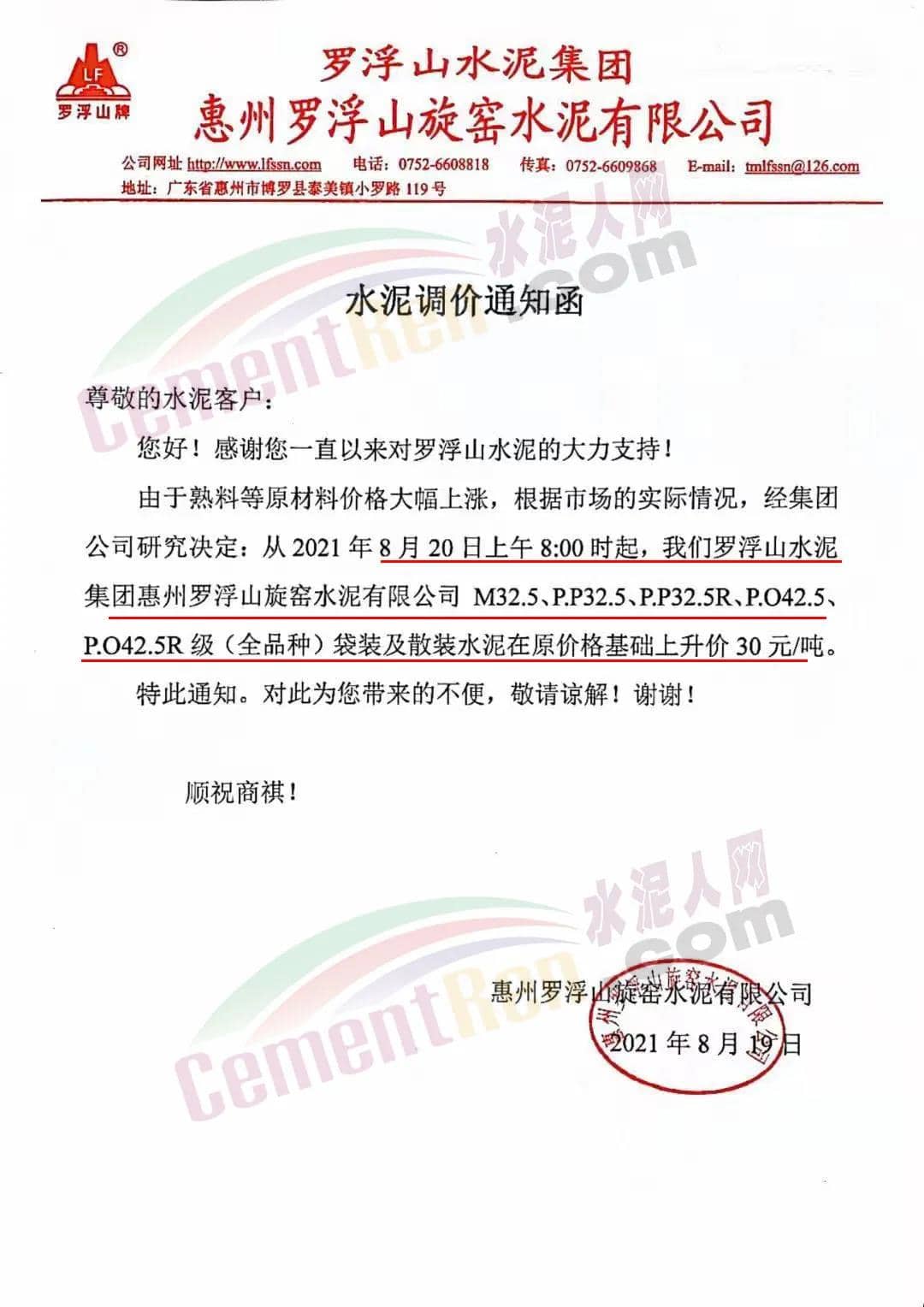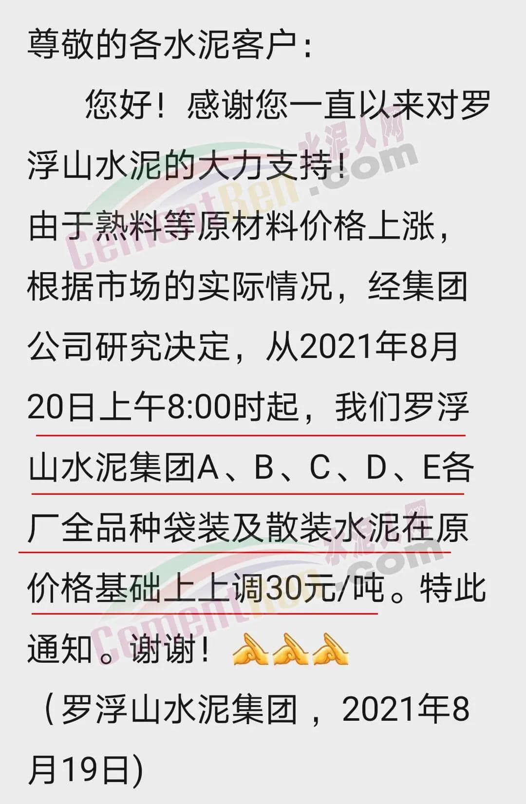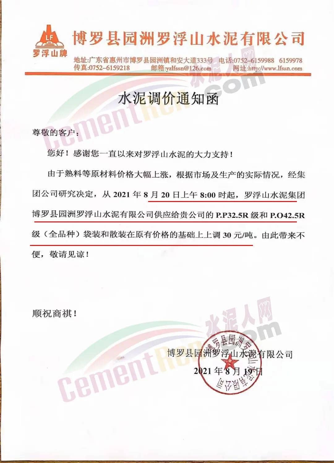 博羅縣園洲羅浮山水泥有限公司通知自8月20日上午8時(shí)起,全品種水泥袋裝和散裝在原價(jià)格基礎(chǔ)上上調(diào)30元/噸。