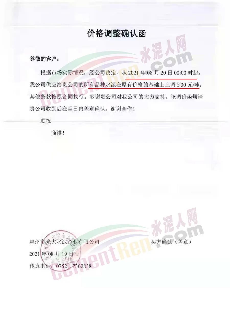光大水泥通知,自8月20日0時(shí)起所有品種水泥在原有價(jià)格的基礎(chǔ)上上調(diào)30元/噸。