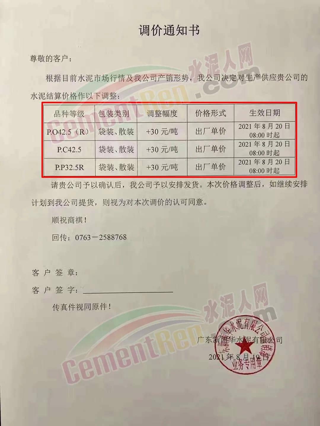 廣東新南華水泥有限公司通知,自8月20日8時(shí)起各標(biāo)號(hào)水泥上調(diào)30元/噸。