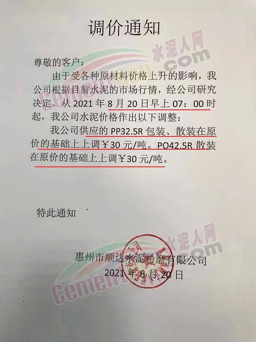 惠州市順達(dá)水泥粉磨有限公司通知,自8月20日早7時(shí)起,旗下各標(biāo)號(hào)水泥上調(diào)30元/噸。