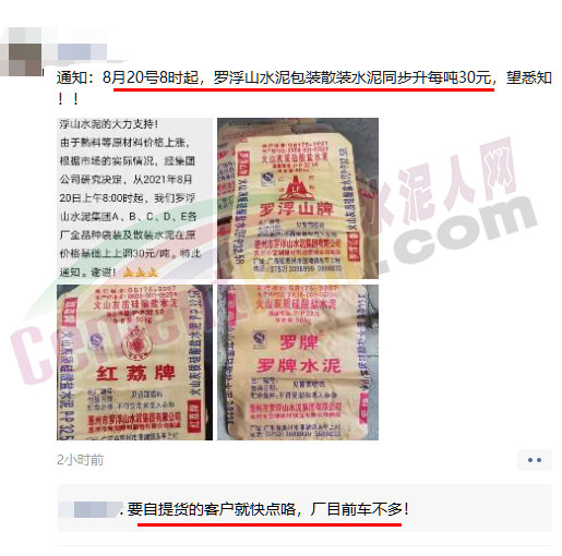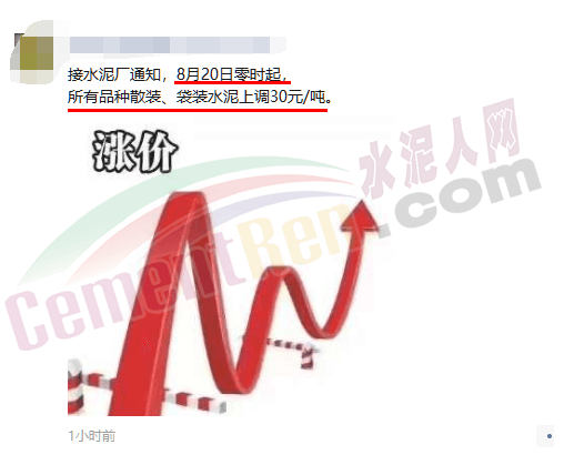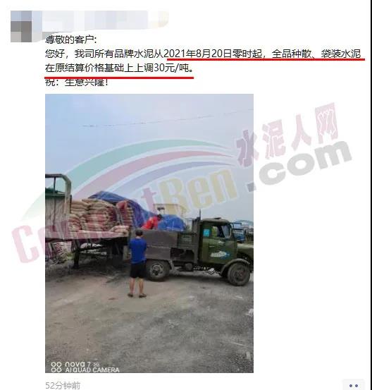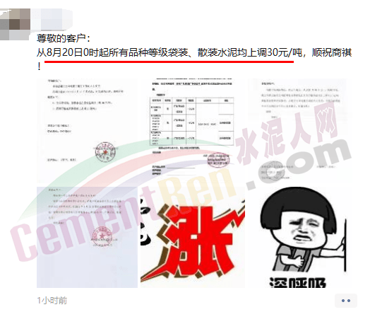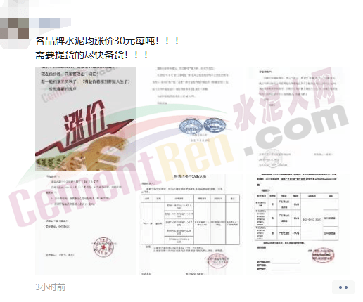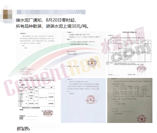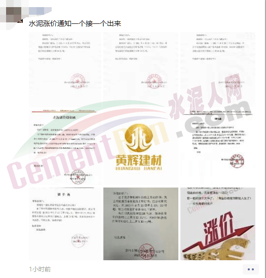 區(qū)域內(nèi)各品牌水泥旗下代理商經(jīng)銷商也紛紛發(fā)布通知,以告知客戶相關(guān)調(diào)價(jià)信息。