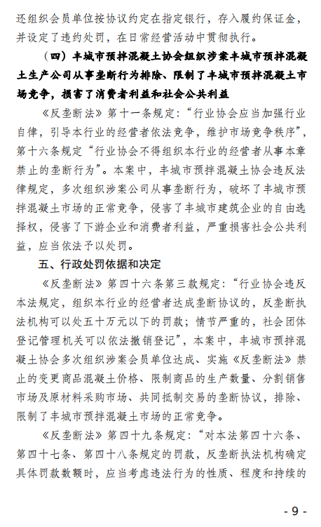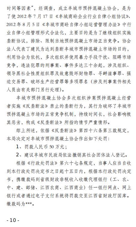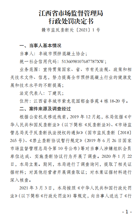 經(jīng)調(diào)查,2021年7月23日,江西省市場監(jiān)督管理局對豐城市預拌混凝土協(xié)會作出罰款50萬元的行政處罰,并建議豐城市民政局依法撤銷其社會團體法人登記;對豐城市閩邑建材公司等6家會員企業(yè)責令停止違法行為,沒收違法所得,并處2018年銷售額8%的罰款;對豐城市晨峰建材公司等2家會員企業(yè)責令停止違法行為,沒收違法所得,并處2018年銷售額3%的罰款。上述罰沒款共計2.86億元。
