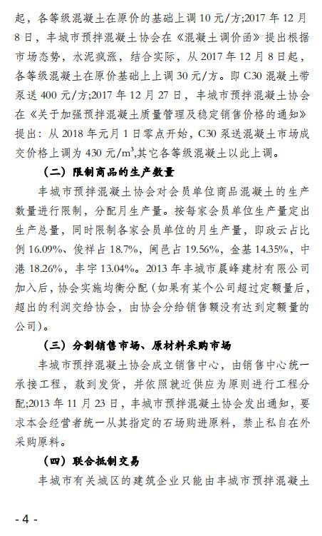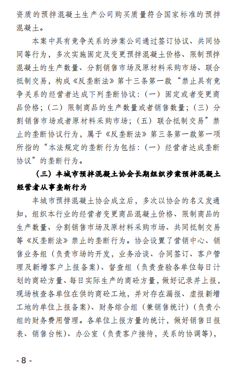 日前,江西省市場監(jiān)管局發(fā)布《豐城市預拌混凝土協(xié)會及其會員企業(yè)壟斷協(xié)議案的處罰決定》根據(jù)公安機關移交線索,江西省市場監(jiān)督管理局于2020年1月對豐城市預拌混凝土協(xié)會及其8家會員企業(yè)涉嫌壟斷協(xié)議行為立案調(diào)查。