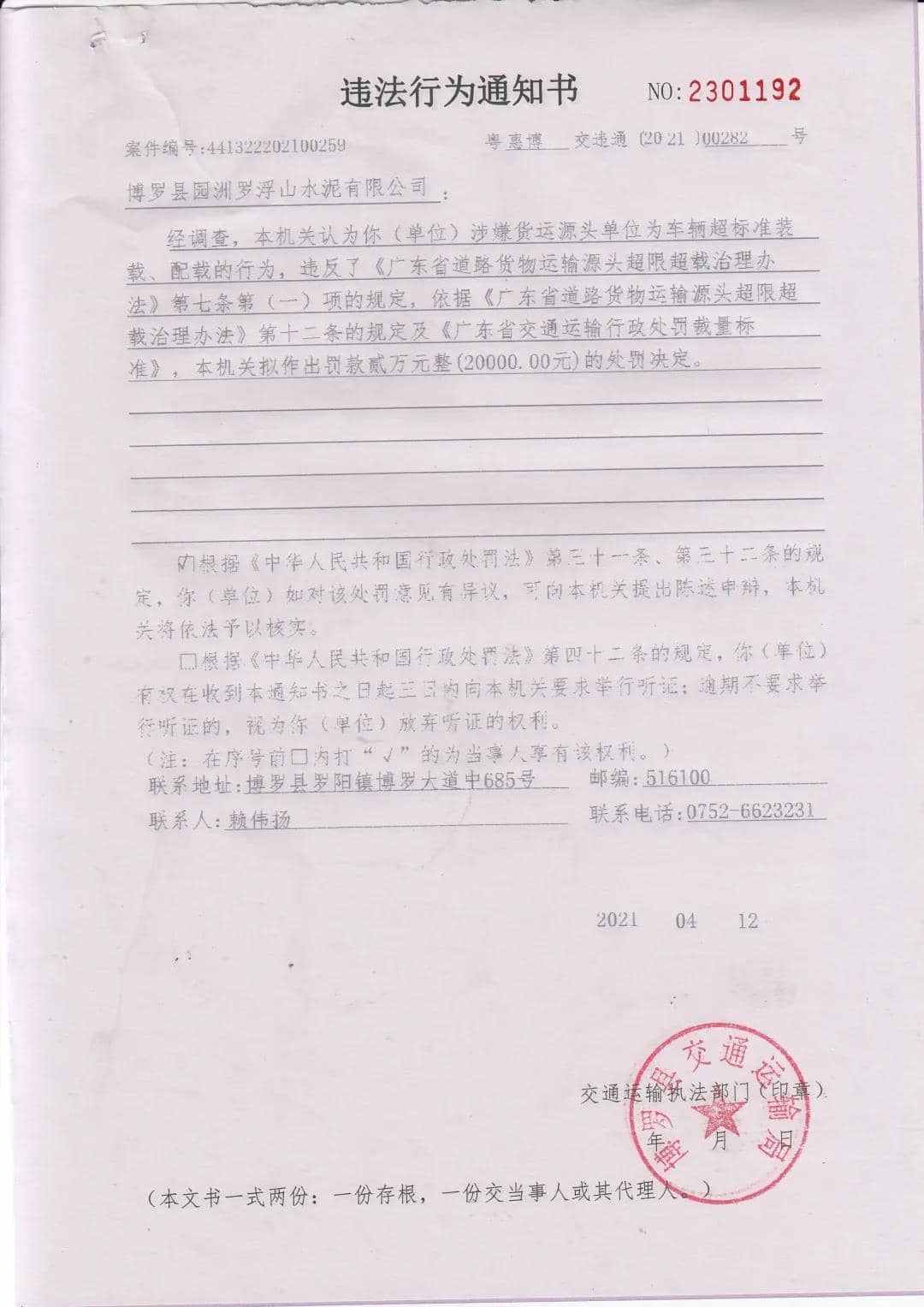 日前,廣州省惠州市博羅縣交通運輸局發(fā)布《關(guān)于向博羅縣園洲羅浮山水泥有限公司送達<違法行為通知書>(惠博交字【2021】00282號)的公告》稱,博羅縣園洲羅浮山水泥有限公司涉嫌貨運源頭單位為車輛超標(biāo)準(zhǔn)裝載、配載,依據(jù)相關(guān)規(guī)定,罰款貳萬元整(20000.00元)。具體公告如下: