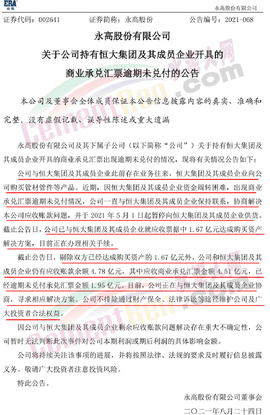 日前,永高股份表示,因恒大集團(tuán)及其成員企業(yè)資金周轉(zhuǎn)困難,出現(xiàn)商業(yè)承兌匯票逾期未兌付情況,公司一直與恒大集團(tuán)及其成員企業(yè)保持聯(lián)系,協(xié)商解決本公司應(yīng)收賬款問題,并于2021年5月1日起暫停向恒大集團(tuán)及其成員企業(yè)供貨。
