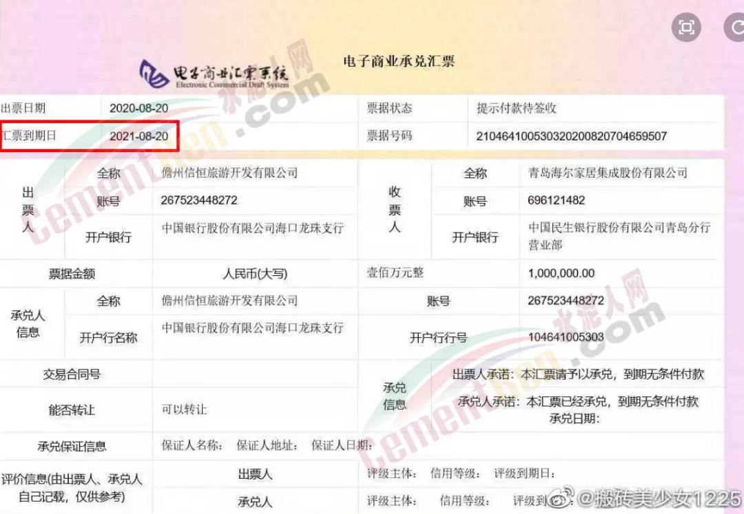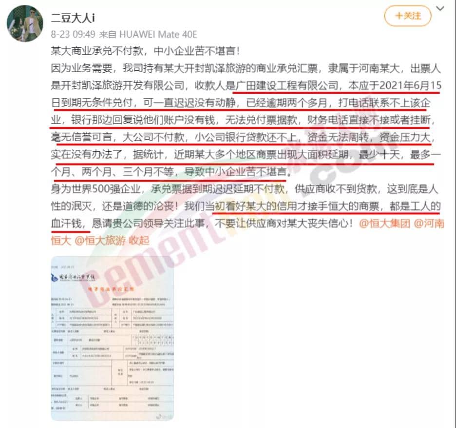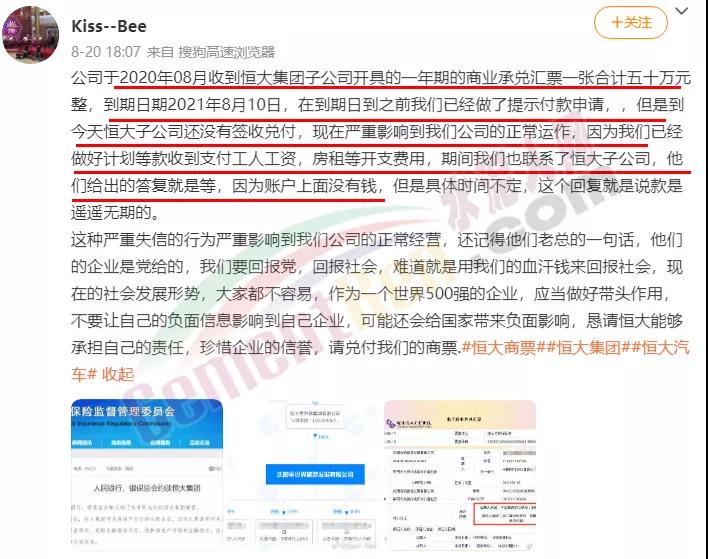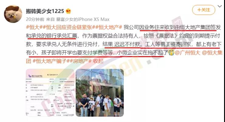 日前,網(wǎng)友“搬磚美少女1225”在社交平臺發(fā)布消息稱“我公司因業(yè)務(wù)往來收到由恒大地產(chǎn)集團(tuán)簽發(fā)和承兌的銀行承兌匯票,作為票據(jù)權(quán)益合法持有人,按照《票據(jù)法》約定的到期提示付款,要求承兌人無條件進(jìn)行兌付,結(jié)果遲遲不付款。工人等著工資寄回家,都上有老下有小,孩子即將開學(xué)也要支付學(xué)費等等…小微企業(yè)實在拖不起了”。