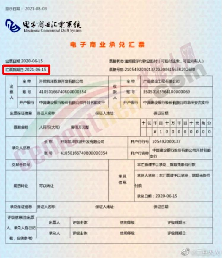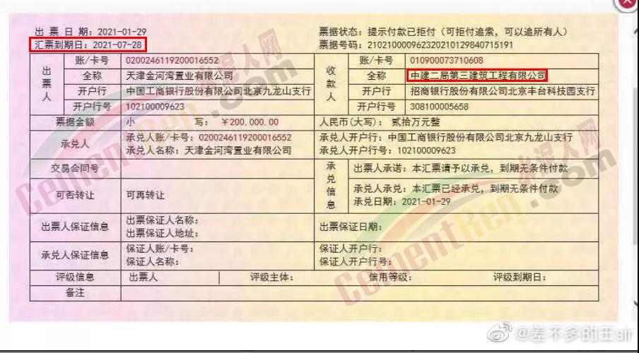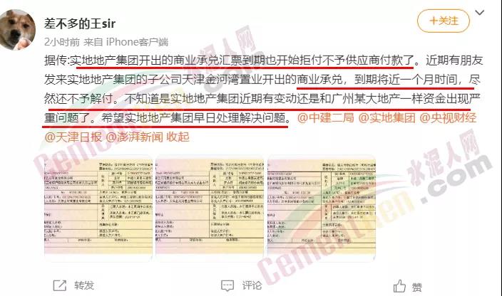 不僅恒大,另一名為“差不多的王sir”發(fā)消息稱“實地地產(chǎn)集團(tuán)開出的商業(yè)承兌匯票到期也開始拒付不予供應(yīng)商付款了。近期有朋友發(fā)來實地地產(chǎn)集團(tuán)的子公司天津金河灣置業(yè)開出的商業(yè)承兌,到期將近一個月時間,竟然還不予解付。不知道是實地地產(chǎn)集團(tuán)近期有變動還是和廣州某大地產(chǎn)一樣資金出現(xiàn)嚴(yán)重問題了。希望實地地產(chǎn)集團(tuán)早日處理解決問題。”