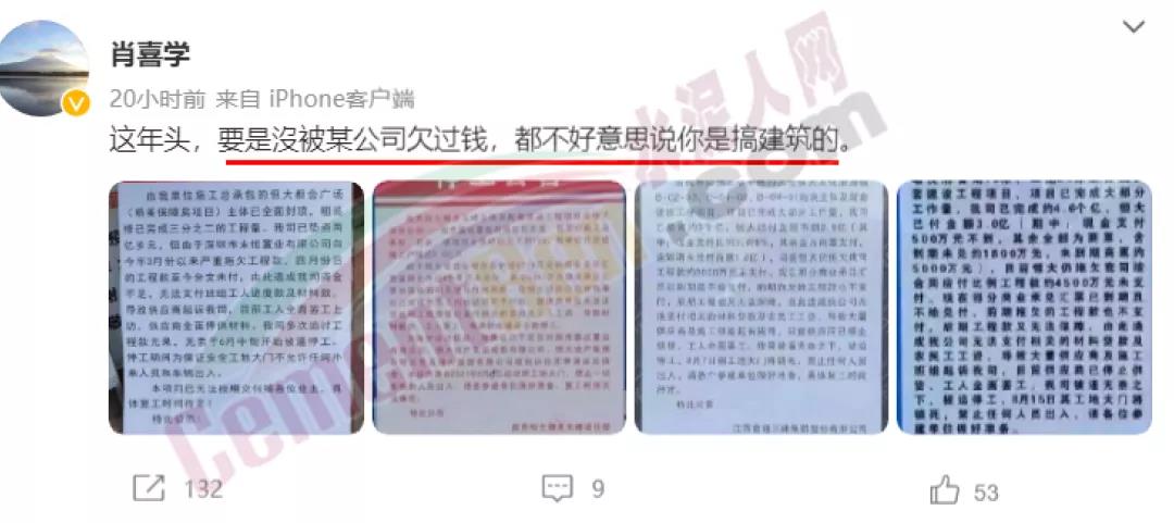 另一微信名為“肖喜學(xué)”的網(wǎng)友調(diào)侃稱:要是沒被“某公司”欠過錢,都不好意思說自己是搞建筑的,附圖片羅列了幾份停工公告。