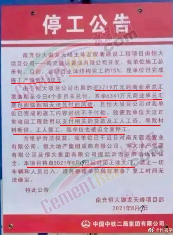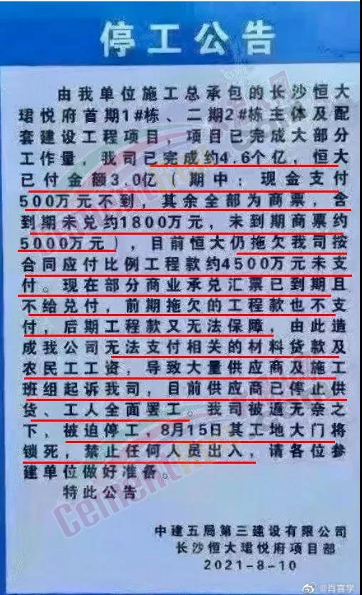 材料供應(yīng)商表示已暫停向恒大集團(tuán)及其成員企業(yè)供貨