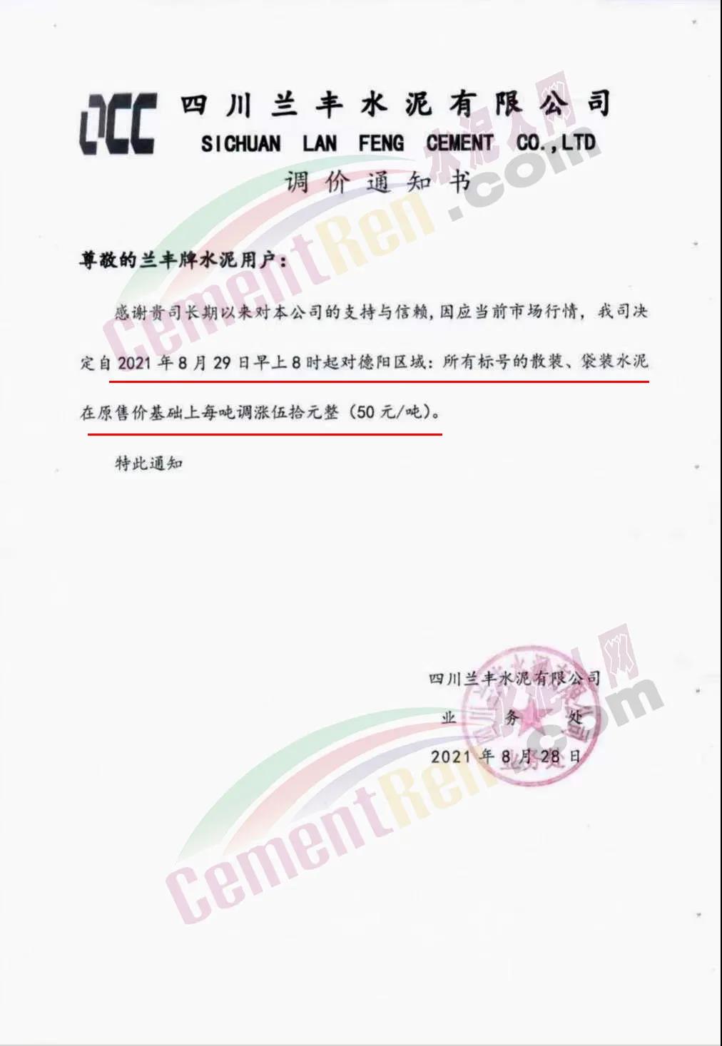 四川蘭豐水泥有限公司通知稱,自8月29日8時起對德陽區(qū)域所有標號的散裝、袋裝水泥在原售價基礎上調漲50元/噸。