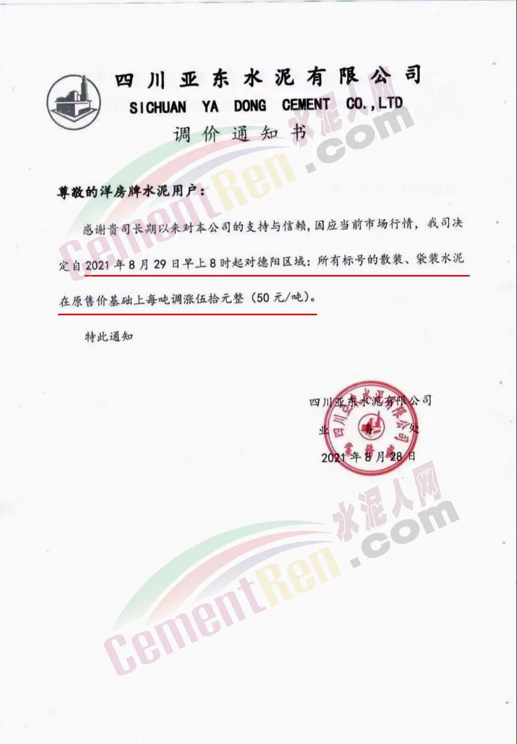 四川亞東水泥通知,自8月29日8時起,對德陽區(qū)域所有標號的散裝、袋裝水泥在原售價基礎上調漲50元/噸。