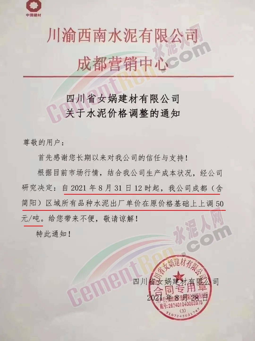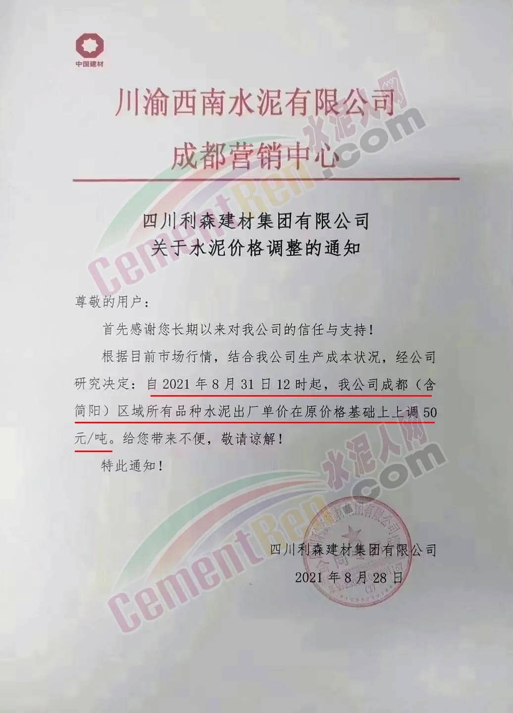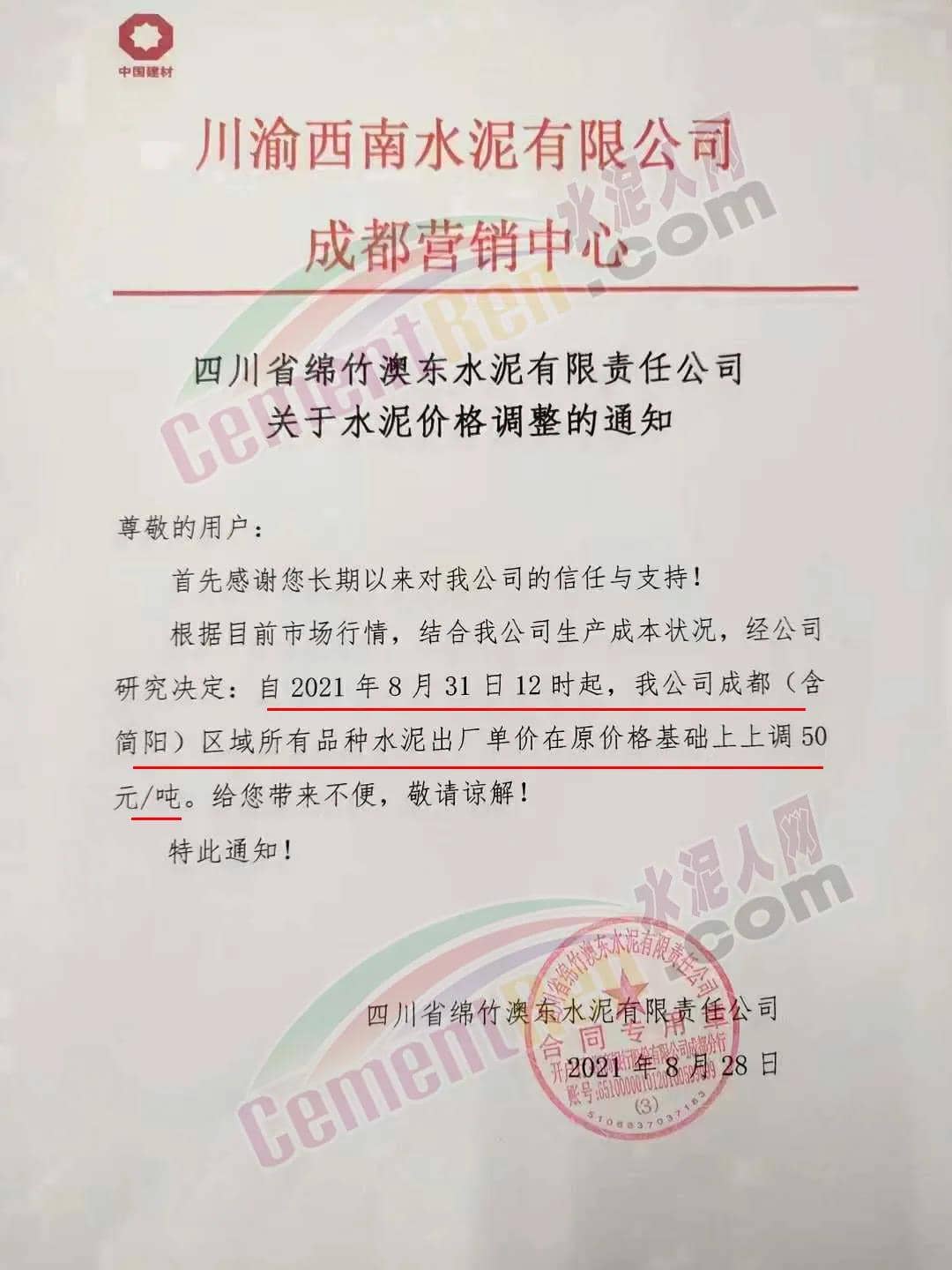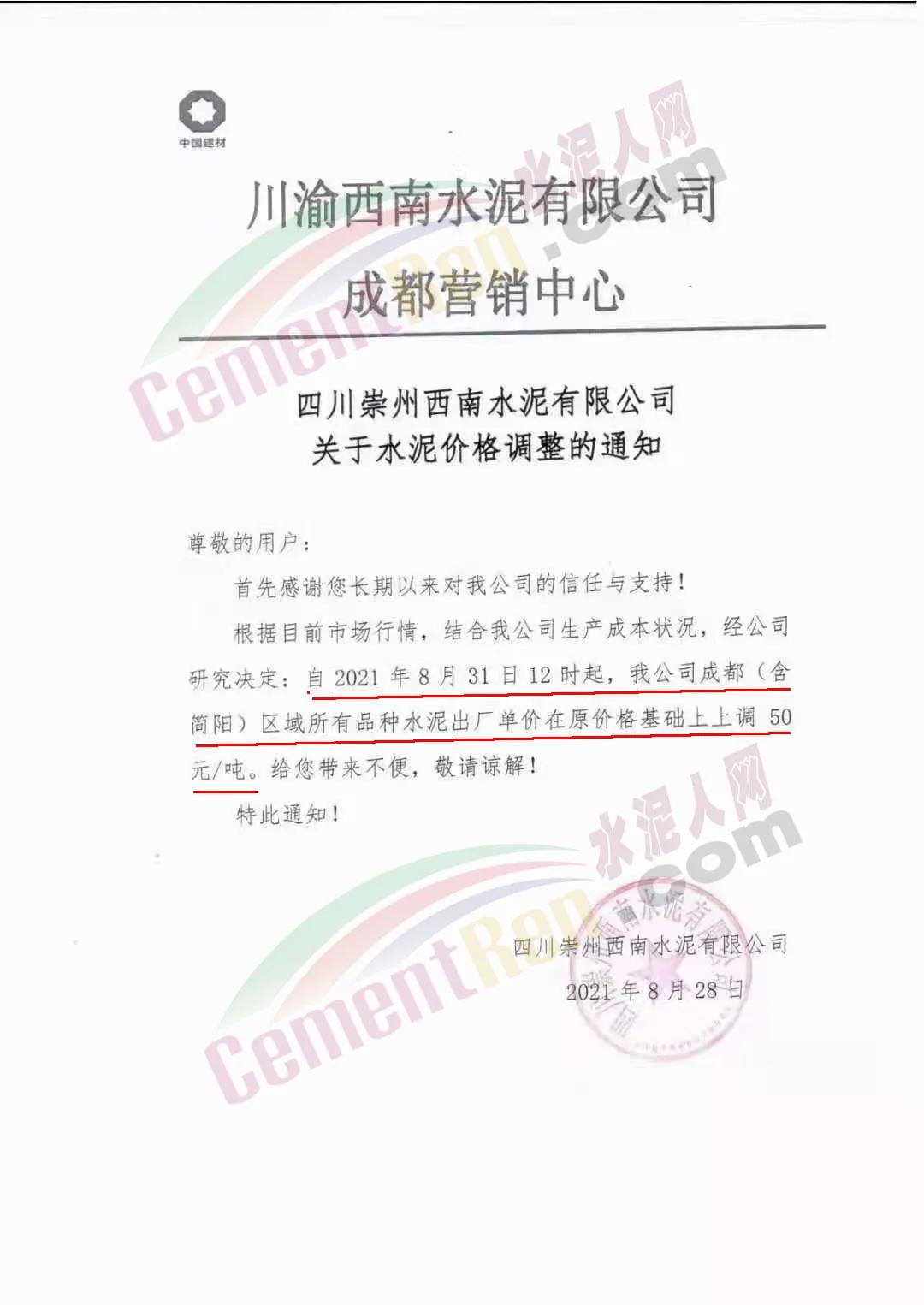 安縣中聯(lián)水泥、崇州西南水泥、四川德勝集團、峨眉山西南水泥、四川利森集團、綿竹澳東水泥、女媧建材等通知稱,根據(jù)目前市場行情 ,結合公司生產成本狀態(tài),經(jīng)公司研究決定自8月31日12時起,成都(含簡陽)區(qū)域所有品牌水泥出廠單價在原價基礎上上調50元/噸。