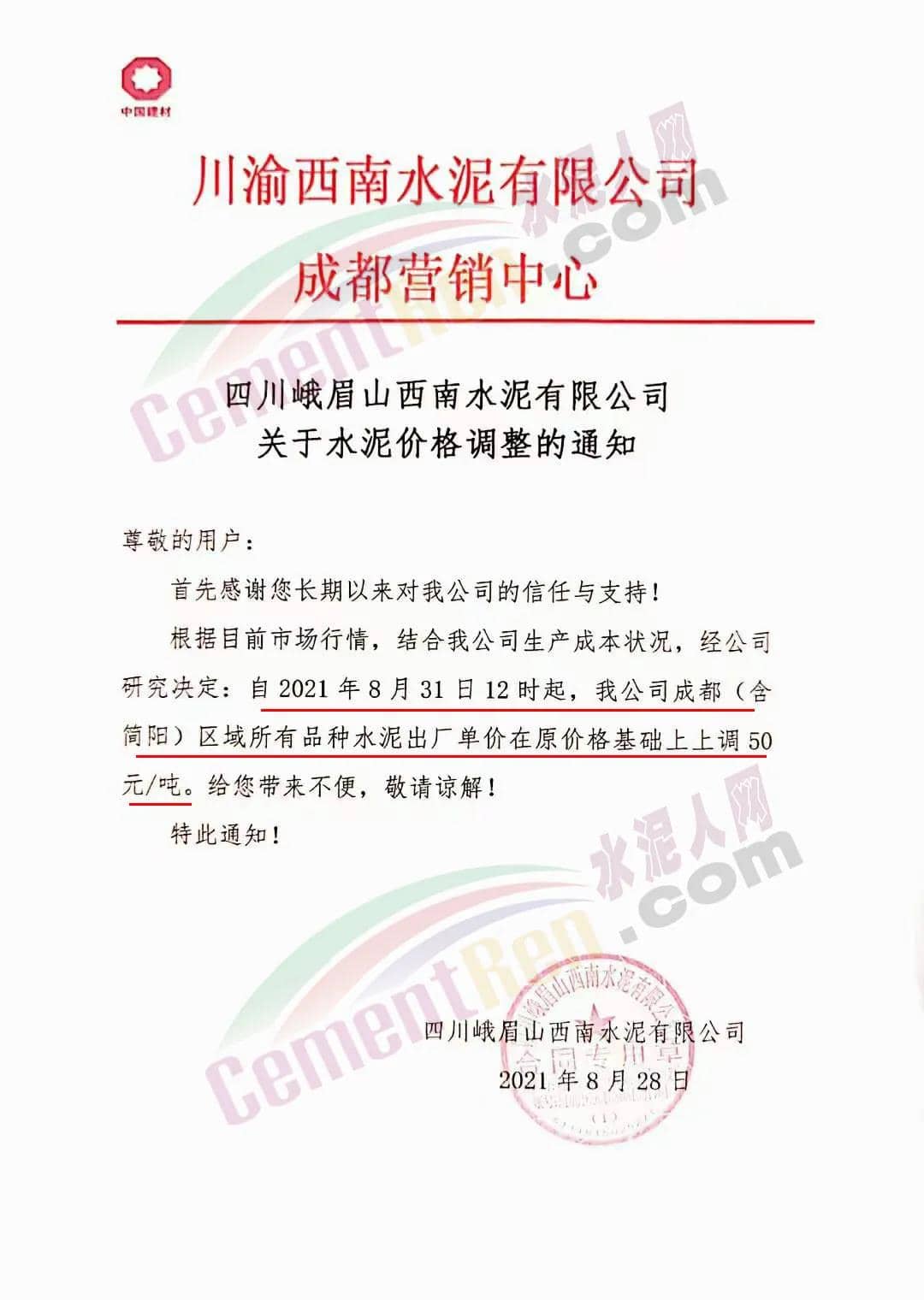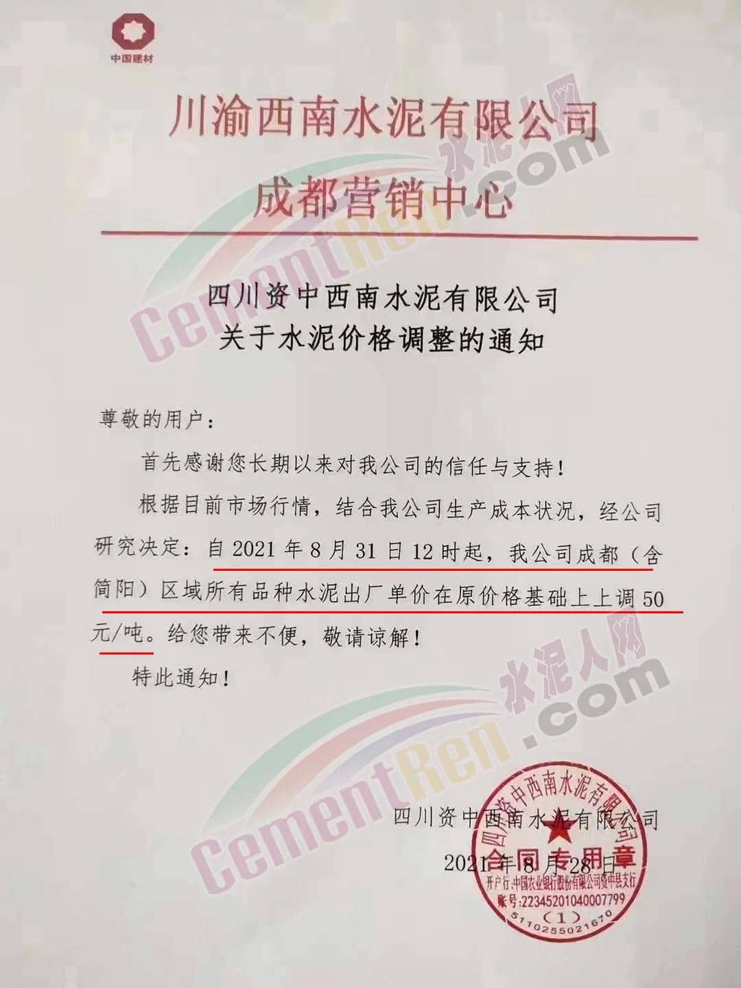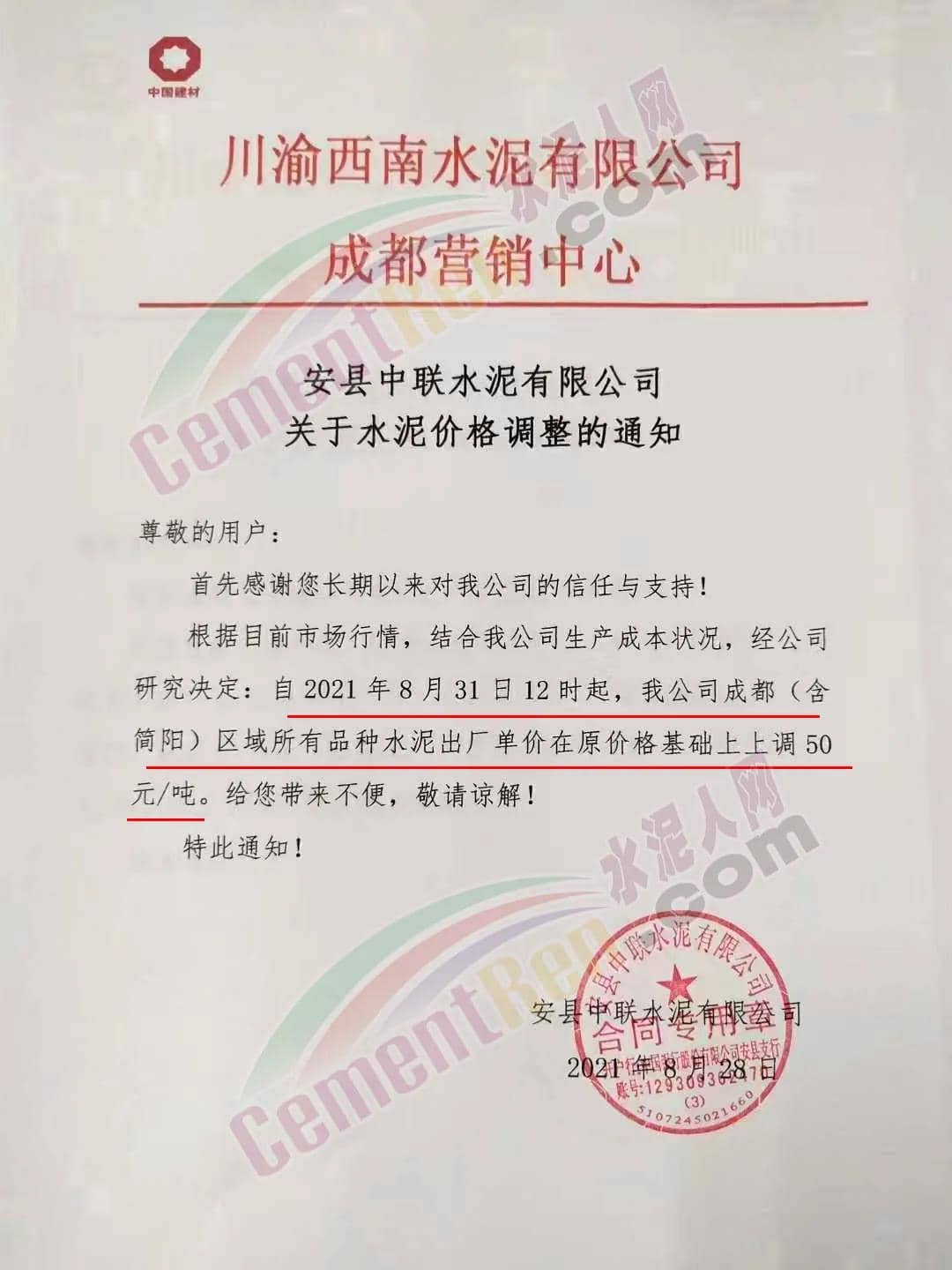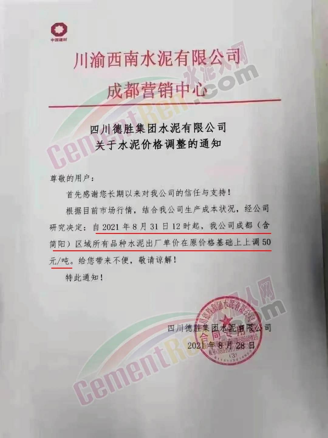 安縣中聯(lián)水泥、崇州西南水泥、四川德勝集團、峨眉山西南水泥、四川利森集團、綿竹澳東水泥、女媧建材等通知稱,根據(jù)目前市場行情 ,結合公司生產成本狀態(tài),經(jīng)公司研究決定自8月31日12時起,成都(含簡陽)區(qū)域所有品牌水泥出廠單價在原價基礎上上調50元/噸。
