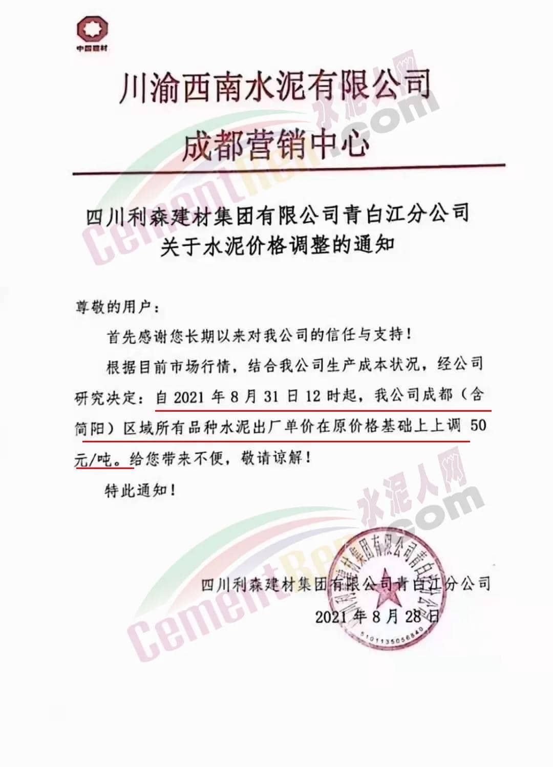 四川利森建材集團青白江分公司通知所有品種水泥出廠價上調50元/噸。